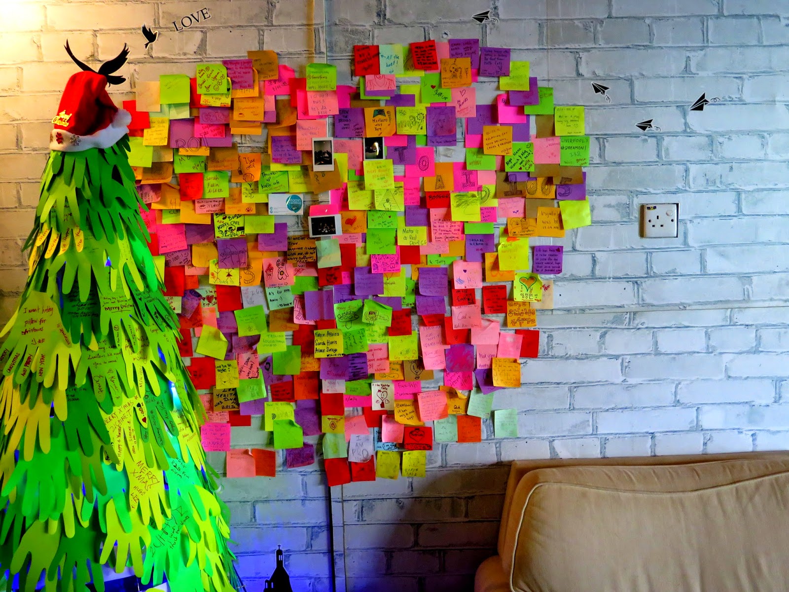 張貼在白墻上的留言紙條,寫上滿滿的祝福,拼湊成一個心形。
