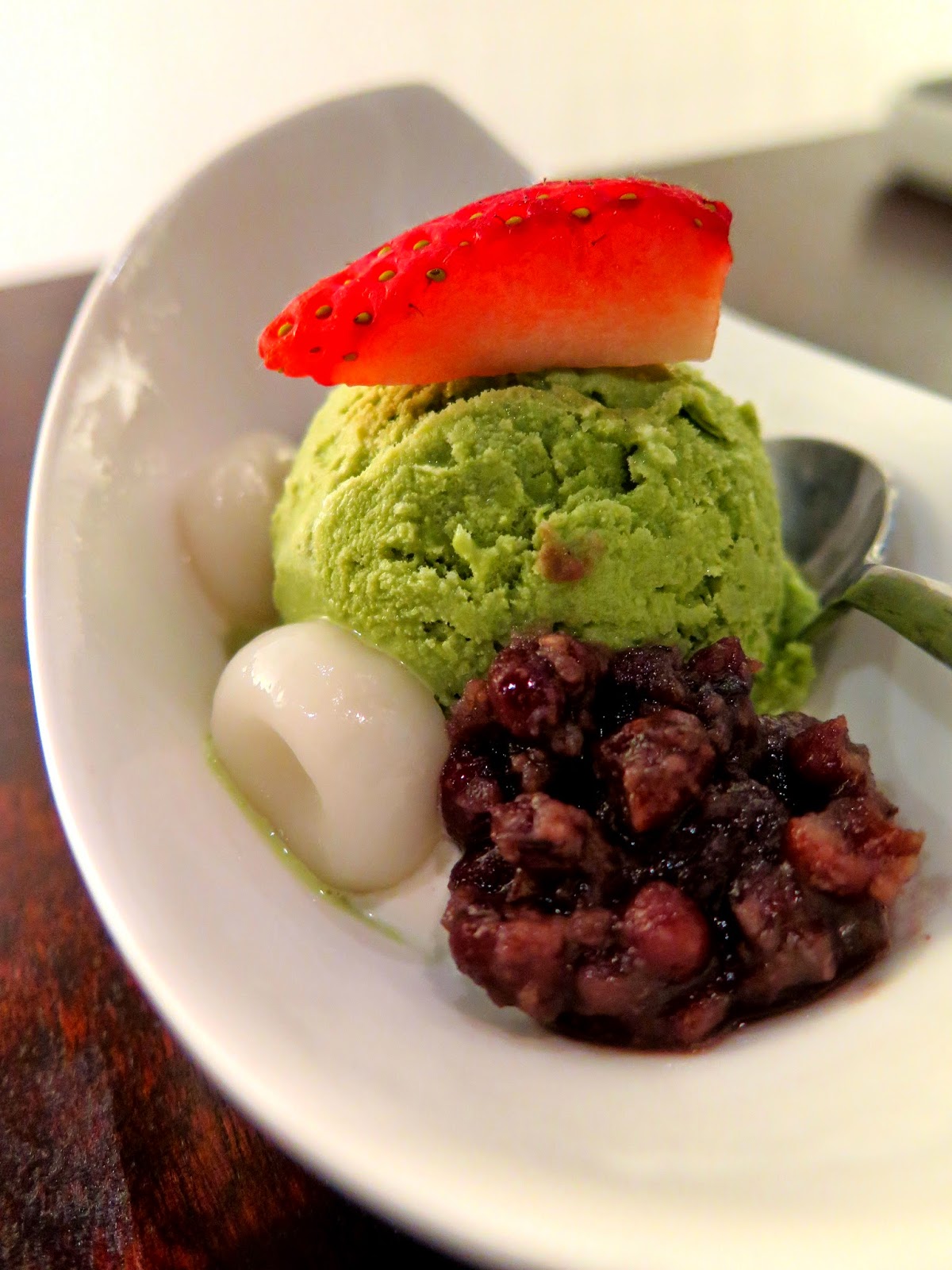 | 自製的綠茶冰淇淋,可以咬到細細的冰沙,甜度適中 搭配寒天或仙草、紅豆、丸子一起吃,口感極佳 |