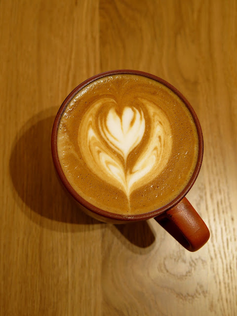 擺放在鐵閘門前的幾張手工藤椅及藤制茶几,為門廊製造了一種復古而愜意的畫面和氛圍,很是好看。同時,也讓人感嘆夕陽工業的手藝將會失傳。門廊外另一邊則建有一個鮮黃色的螺旋式鐵藝樓梯,富有歐式古典風格,帶有一種歐式古舊的風格。樓梯邊是復古的70年代橡膠繩椅(Merdeka Chair)。門後擱置在水泥地上的小黑板上寫著當日的特別餐單。咖啡館的長形水吧檯和櫃檯正面面對著大門,與室內的牆面一樣都是紅磚材質。古舊笨重的實木餐桌椅在紅磚牆面的圍繞下,隱含著復古浪漫的情懷。
